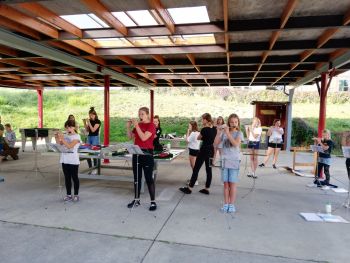 Die Spielmäuse lernten neben dem täglichen Frühsport ihre Instrumente kennen. Dabei war die Freude riesig, denn schließlich „kann mich beim Flöte spielen die ganze Welt hören“! In jeder Übungsgruppe wurde sehr viel Wert auf das Marschtraining gelegt sowie auf die richtige und selbstbewusste Haltung der Instrumente.
